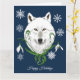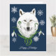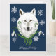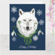 Um lobo ártico branco com flores de queda de neve desenhado no estilo art nouveau. Um pano de fundo azul escuro e flocos de neve atrás e em volta do lobo ártico.