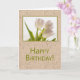 Este cartão de aniversário elegante apresenta uma fotografia de flores tulipas brancas dançantes. O fundo texturizado agrega interesse e variedade ao design.
