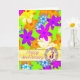 Um cartão de aniversário de casamento para dar àquele que você ama. Flores fabulosas de 'op art' em cores brilhantes. Um cartão vibrante que diz 'Feliz!'. As flores multicoloridas são espalhadas em um fundo verde. O cartão é deixado em branco para ser usado como cartão de nota ou para sua própria mensagem. Veja toda a gama de cartões na minha loja. Todos os direitos autorais da arte por Norma Cornes.