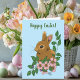 Coelho marrom giro com flores cor-de-rosa contra o pano de fundo azul claro