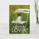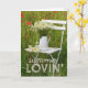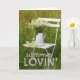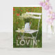 Design de cartão de saudação adorável e editável com um belo motivo de verão. Uma cadeira branca de madeira num campo de verão com um vaso com flores brancas chamomile. Poppies à volta da cadeira. Aproveite! © Fotografia por UtART 2017