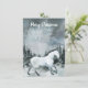 Um ditado personalizável, cartão de Feliz Natal com um cavalo branco pintado à aguarela contra uma floresta de madeira de inverno ao crepúsculo. A parte de trás do cartão apresenta um fundo opaco para escrever uma nota.