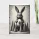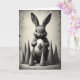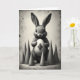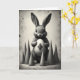 This card features a fluffy rabbit 🐇 drawn in soft black and gray tones, centered on a muted, parchment-like background that looks gently aged with scattered speckles. The rabbit faces forward with large dark eyes, giving it a tender, trusting look, as if it’s quietly sharing a secret with someone close. Cradled in its front paws is a smooth, egg-shaped object marked with a dark diamond pattern, creating a small focal point that feels like a treasured gift. A semi-circle of evenly sized cone-like shapes sits behind the rabbit, like quiet guardians that frame the scene and add a sense of closeness around the pair. Soft, diffused lighting brings out the fine texture of the fur while keeping the egg’s surface sleek and slightly reflective. Any greeting text appears near the top in small, dark lettering that matches the artwork, leaving the center open so the rabbit’s gaze does the talking 🌷. Behind the rabbit, the cones form a neat arc against the faded tan backdrop, with darker flecks and worn marks scattered across the edges.