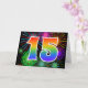 A frente desta design de empolgante, divertida e vibrante placa de saudação apresenta um padrão colorido inspirado em fogos de artifício celebratórios, juntamente com o número "15", que apresenta um arco-íris multicolorido como um padrão de gradiente, em um fundo preto colorido. O dentro apresenta uma mensagem de saudação personalizada, ou talvez possa ser apagado e deixado o vazio se uma mensagem for escrita manualmente. Uma carta de boas-vindas como esta poderia ser uma maneira divertida e feliz de enviar uma mensagem de boas-vindas a alguém que comemora seu décimo quinto aniversário, ou talvez a um casal que comemora seu décimo quinto aniversário de casamento, ou a alguém que comemora outro evento de 15. [~Z0000342]