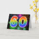 A parte dianteira destes excitação, divertimento, e características de design vibrantes do cartão um teste padrão colorido inspirado por fogos-de-artifício comemorativos, junto com o número "60" caracterizando um arco-íris colorido inspirou o teste padrão do inclinação, em um fundo colorido preto. As características internas uma mensagem de cumprimento personalizada, ou poderiam talvez ser canceladas e sairiam do vazio se uma mensagem deve ser escrita à mão pelo contrário. Um cartão como este poderia ser um divertimento, maneira feliz de enviar uma mensagem do cumprimento a alguém que está comemorando seu sixtieth aniversário, ou talvez a um casal que comemora seu sixtieth aniversário de casamento, ou a alguém que comemora algum outro 60th evento. [~Z0000342]