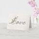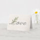 Texto LOVE em letra de script elegante com folhas verdes em fundo de textura neutra suave para recém-casados
