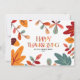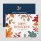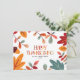 Um cartão colorido com texto feliz e divertido de ação de graças e folhagem de outono. O cartão contém uma mensagem de boas-vindas maravilhosa no verso, que pode ser personalizada. Você também pode editar o texto e as cores.
