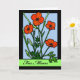 For Mom, Happy Birthday paper greeting card with an illustration of red poppies inside a black frame. Illustration looks like stained glass with the black outlines. Bright red poppies with dark green stems and leaves. Light blue sky background. Poppy element courtesy of Openclipart. Art, image, and verse copyright © Shoaff Ballanger Studios.