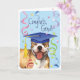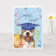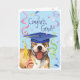Felicite o seu formando favorito com um presente que apresenta um formando americano feliz e giro Pit Bull Terrier vestindo um quadro-negro em meio a um monte de confete.