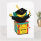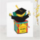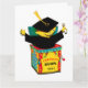 Cartão de formatura criativo com humor de caixa surpresa de desenho animado. Edite o texto para incluir o nome do formando e o ano da turma.