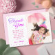 Cartões de agradecimentos de fotos de aniversário de estrelas rosa-claro. Obrigado seu convidado por vir à festa de aniversário do seu filho! O design tem estrelas rosa e uma foto - insira sua foto no modelo. O texto está cor-de-rosa - altere o obrigado da mensagem, se desejar, e o nome da criança.