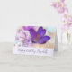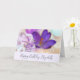 Cartão de aniversário com uma fotografia adorável de um pote de vidro de dentro de roco roxo escuro. Uma flor roxa leve está presente no fundo.