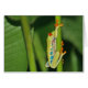 Foto de um sapo de árvore colorido que escala na haste de uma planta. O sapo tem os olhos vermelhos, os pés alaranjados e listras azuis acima do lado de seu corpo, que é verde de outra maneira. Isto é chamado um sapo de árvore garrido da folha, e a fotografia foi recolhida os trópicos de Costa Rica.