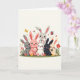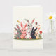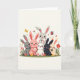 This card shows five stylized bunnies cuddled close on a green strip of grass 🐰. A larger gray bunny sits in the middle with pink inner ears and a calm, affectionate gaze that draws the group together. To one side, a pastel pink bunny leans in as if giving a gentle hug, while a white bunny nearby shows tiny pink paw pads, adding a sweet, friendly touch. A sleek black bunny and a creamy tan bunny complete the cluster, their rosy cheeks and wide eyes turned toward one another like close companions sharing a quiet moment 🐇. The background stays light and airy, letting the soft colors of the bunnies stand out against the spring setting. Small wildflowers in red, yellow, and pink dot the grass with leafy green sprigs, and the greeting text sits near the top in a soft gray tone. Two butterflies float above—one golden yellow and one red with black accents—hovering over the group.