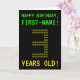 The front of this nerdy, personalized birthday card design features the messages "HAPPY BIRTHDAY" and "3 YEARS OLD!", along with a editable recipient name. The messages on the front have an appearance inspired by pixelated vintage/classic/retro video games. The number "3" on the front is itself made up of smaller sized "3" digits, giving an ASCII art inspired look. The inside features a birthday greeting message that can be customized. A geeky style, personalized birthday greeting card like this might be given to somebody who is celebrating their 3rd birthday. [~Z0000366]