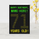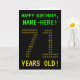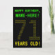 The front of this geeky, customizable birthday card design features the messages "HAPPY BIRTHDAY" and "71 YEARS OLD!", along with a personalized recipient name. The messages on the front have an appearance inspired by pixelated vintage/classic/retro video games. The digits of the large number "71" on the front are themselves made up of smaller sized "7" or "1" digits, giving an ASCII art inspired look. The inside features a birthday greeting message that can be personalized. A nerdy style, personalized birthday greeting card like this might be a special way to send a birthday greeting to somebody who is celebrating their seventy first birthday. [~Z0000366]