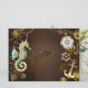 Fundo de madeira castanho com fundo marinho, cordilheira mecânica, volante antigo, âncora de ouro e diversas engrenagens de ouro e latão. Estilo Steampunk.
