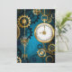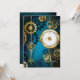Turquesa, texturizada, fundo steampunk com latão e engrenagens douradas, chave prateada e relógio. Estilo Steampunk.