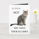 A cute and funny birthday card featuring a cat with glasses on the front and wine glasses on the inside.