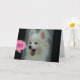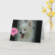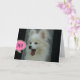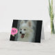 Cute and funny photo of a white Pomeranian puppy with mouth open wide and the shout out- Hi! on a greeting card with customizable text inside. © Little Wing Photo & Design
