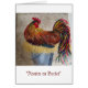 Original no grande azulejo da ardósia. As penas de Blilliant drapejam graciosa sobre o balde que o galo se está sentando sobre, na cama da palha.