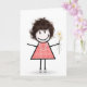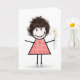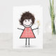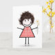 Bonita figura de palito com cabelo, vestido de gingham, colar de pérolas, tênis, e segurando um buquê de margarida em fundo branco.