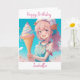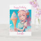Cartão de aniversário para uma garota. Linda menina anime rosa, roxa e azul com arte AI de cone sorvete branco.