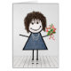 Menina de pau branca com tênis para vestir cabelos e buquês de flores, colar de pérolas e vestido de jean azul no chão de madeira