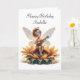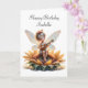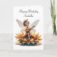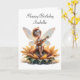 Cartão de Aniversário Personalizado para uma rapariga com uma página de dentro. Uma fada bonita tocando violino ou viola sentada num girassol amarelo grande.