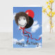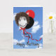 Rosto sorridente da garota com cabelo estranho num balão de aniversário branco e fundo do céu. O plano de fundo pode ser alterado.
