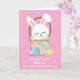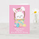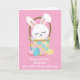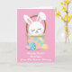 Personalize este cartão coelhinho de Felz pascoa bonitinho com o seu próprio texto personalizado com o nome dos seus filhos em branco. Este adorável coelho senta-se numa bonito cesta de Páscoa com um belo cartão cor-de-rosa.