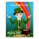 Irlandês diria que se encontra um pote de ouro no final de um arco-íris. O "pote" é algo que você realmente quer ter ou alcançar. Talvez a realização de suas esperanças e sonhos. A tradição irlandesa também diz que aqueles que encontram um trevo de quatro folhas estão destinados à boa sorte. Estas inspiraram a ilustração colorida deste produto, que visava celebrar o Dia de São Patrício. Um garoto vestido de esmeralda-verde e vestindo um chapéu esmeraldo-verde-esmeraldo é aplausos porque é um dia festivo e seu aniversário também. Todo texto é personalizável.