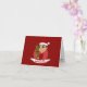 Cartão comemorativo com a ilustração de um lindo menino feliz sorridente, ele está vestindo uma fantasia vermelha e branca de Papai Noel e segurando um presente; com um modelo de texto editável para seu nome ou mensagem, design de Natal com fundo vermelho