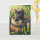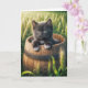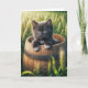 Um pequeno gatinho preto com olhos verdes senta-se confortavelmente dentro um barril de madeira em meio a um campo de trigo alto e verde por pensar em você. O texto pode ser alterado.