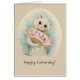 Cartão comemorativo inspirado por uma aquarela do "artista de gato" britânico Louis Wain. A imagem mostra uma gata branca sorridente se resfriando (?) com um ventilador rosa, decorada com flores vermelhas. Personalize o cartão de saudação simplesmente digitando sobre os textos de exemplo.