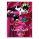 Gato branco preto esfarrapado, engraçado, natural e mascarado com chapéu de Arlecchino em rosas vibrantes, roupas de seda fuchsia com um dentro monograma de foca vermelha. Máscaras elegantes, coloridas, artísticas venezianas com penas pavão da nossa Coleção com fantasia floral de ouro, e florescimento roxo brilhante, vermelho, violeta. Pintura a aquarela original, fotografia, colagem digital e Design gráfico por Búlgaro Lumini - Baldesign3d (c)