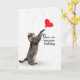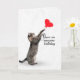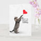 Cinza jogada por gato com balão de coração vermelho em fundo branco enrugado para o aniversário.
