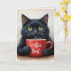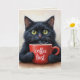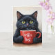 Um gato preto com olhos verdes brilhantes segura uma caneca de café vermelha que diz "café primeiro". O texto do dentro pode ser alterado.