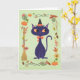 Um gato preto, mágico, dona um chapéu de bruxa pontiagudo cercado por flores e vassouras. Delicadamente colocado sobre uma casa de banho, verde, fundo.