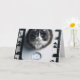 Um gato de terno preto e branco fofinho senta-se numa balança de banheiro, indicando que está acima do peso.