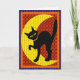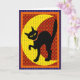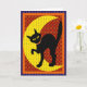 Um cartão de saudação de Halloween com um gato preto a treinar na lua. Bordas "colchadas" padrão melhoram essa imagem colorida.