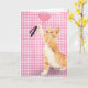 Dourado gato com balão de coração cor-de-rosa para o 4º aniversário em fundo de gingham branco e rosa.
