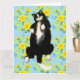 Pintura em aquarela de um gato preto e branco de smoking, fundo floral.