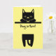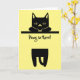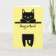 Este cartão tem um gato preto giro pendurado num bar contra um fundo amarelo e palavras para encorajar: