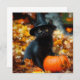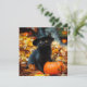 Cartão com um adorável gato preto vestindo o chapéu de bruxa! Esta pequena bolinha se posou com uma abóbora. O outono deixa tapete no chão da floresta. Um presente perfeito para as comemorações do Dia das Bruxas!