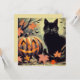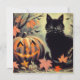 Aqui está uma ilustração de Halloween com aparência retrô de um gato preto e uma abóbora de Halloween. Ao redor do gato e da abóbora estão algumas folhas de outono e árvores secas. Definitivamente, tem um clima de especiarias de abóbora assustadoras. É um ótimo cartão de Halloween e é perfeito para saudações da temporada de terror, convites ou para acompanhar um presente.