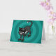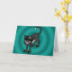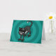 Um cartão de saudação preto com um desenho em preto e branco vestindo dois pares de skates de roletas, meias de stripey preto e branco e um capacete de segurança.