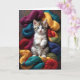 Lindo gato tabby cinza e branco com olhos azuis se acomodou entre fios coloridos de lã neste cartão de cumprimentos em branco.