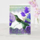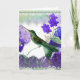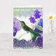 Um belo beija-flor verde iridescente, empoleirado sobre um delicado caule vegetal, rodeado de flores roxas e azuis, incluindo Hydrangeas, bordado por cristais multicolores, pérolas verdes de foca e design de rendas roxas.