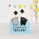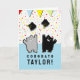 Cartão de graduação bonito com desenhos engraçados lançando bonés no ar. Para personalizar, edite texto para adicionar o nome do formando.
